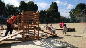 広~いグラウンドの真ん中で堂々と登ったりぶら下がったりの子どもたち。