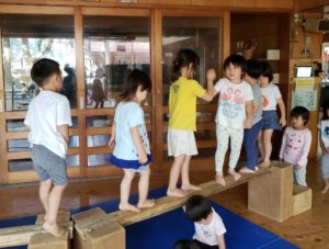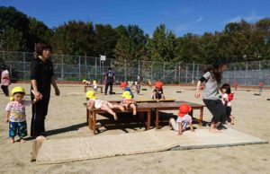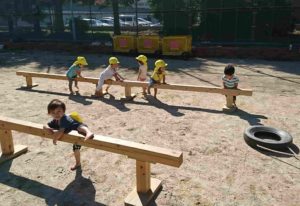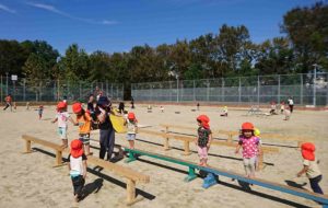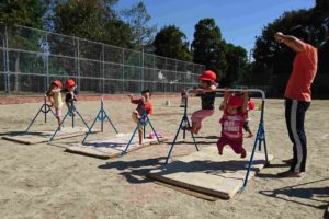 3週間後の運動会へむけて、1歳児~5歳児がリズムやかけっこ、平均台や鉄棒・机飛び降り・机登りなどなど様々な競技を『グラウンドで遊ぼう』の中で展開しています。