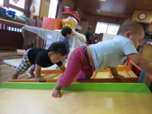 緩やかな斜面・急な斜面・はたまた階段のぼり・園庭での築山などで「四つ這い」や「高這い」をたくさん保障し、しっかりとした太もも・足腰へ育てたいですね。