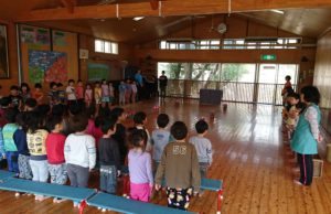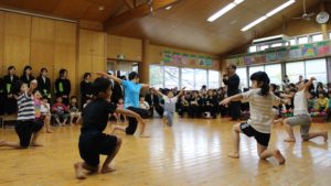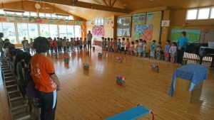 今日は4歳児と5歳児がホールに集まり、リハーサルを行いました。