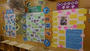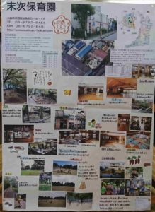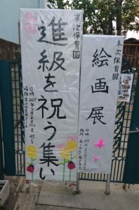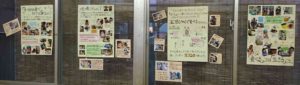絵画展で子どもの描画や制作物のほかに、「末次保育園の保育をもっと知ってもらいたい」ということで、去年から『末次ブース』を設置し、保育園・食(給食)・斎藤公子の保育・リズムあそび・ロールマット・砂泥水などなどを写真や文献からの一文などを掲示し、わかりやすく紹介しています。