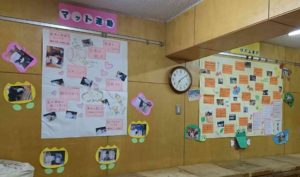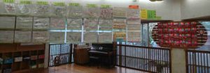 (各部屋に子どもの描画と製作物を掲示しています)