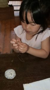 根気と集中力のいる手先の活動で、まずは小さな針の穴に糸を通すところから始まります。