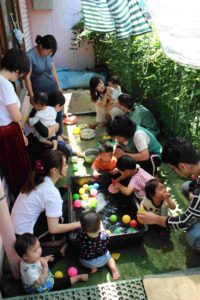 お部屋でふれあい遊びをしたり、絵本を読んでもらったり、水遊び、室内遊びなどの様子を見てもらいました。