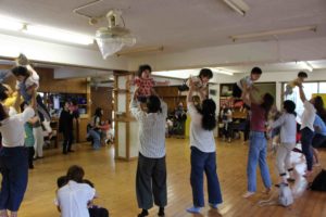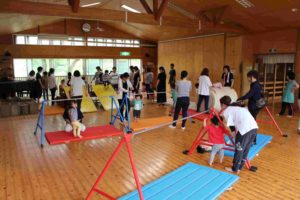 ホールでアスレチックで遊んでから、親子ふれ合いやリズムをして子どもの様子を見てもらいました。