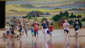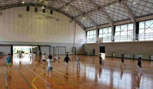 お弁当や虫取りのあと雨がなかなか止まなかったので、旅館の方にお願いをして体育館を準備していただきました。