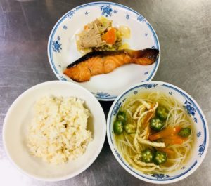 今日の「七夕メニュー」は、鮭の幽庵焼き・豚しゃぶサラダ・七夕汁です。