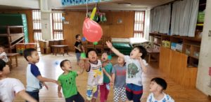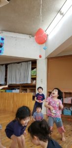 本物のふうせんをぶら下げて、折り紙のふうせんを投げ当て遊びに発展。