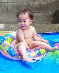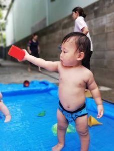 0歳児ひよこ組は、テラスを飛び出して園庭の方で「水遊び」