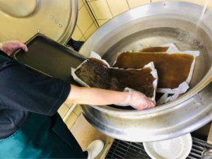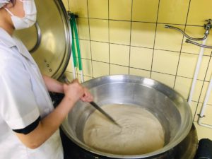 大きな回転ガマとヘラ(ののじ)を使い、手を止めることなく混ぜ続け、更に蒸し器で蒸し、冷やします。
