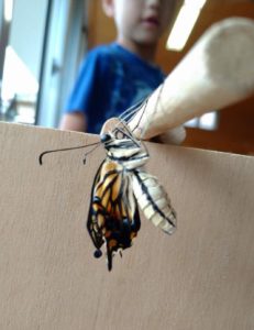 今朝の登園時、さなぎが皮を脱ぎチョウになっていくところに、年長の子どもたちが出くわしました。