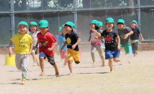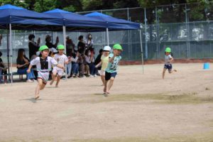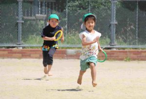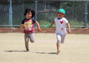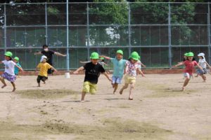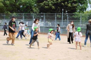 子どもたちは、暑い中でも元気に「走る」遊びを中心に、保護者の皆さんと一緒に身体を動かし遊んでいました。
