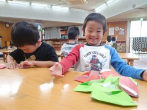 子どもたちは「茶色いどんぐり沢山あったなぁ!」「緑のも落ちてたよ!」と楽しそうに折っていました!