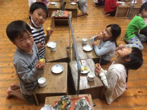 大人気であっという間に空っぽでした♬年長組さんは、焼き芋をしようと朝からお芋を洗って、新聞紙とアルミホイルを巻いて準備。だけどあいにくの雨で焼き芋はできませんでしたが、調理室のオーブンで焼いていただきました♪