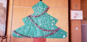 壁に貼られた「裸の木」に、それぞれ思い思いのクリスマス飾りを、描いて・着色をして・切り抜いて・貼ってと、その一連の工程をとっても楽しんでいます。