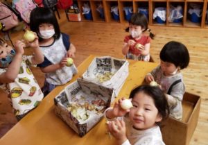 皮を自然にむきむきする姿を眺めている子どもたちを見たお台所の先生が、午後からクラスで玉ねぎむきを