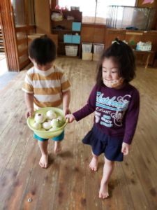 縁側下に干している玉ねぎを、お台所の先生が取っているのを子どもたちが見ていました。