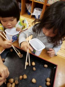 枚岡公園散歩で拾ったどんぐりで、『お箸でつかめるかな~?』で遊んでみました。
