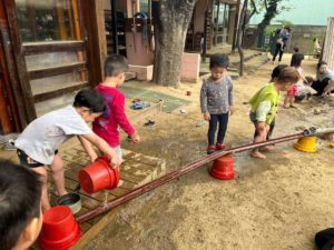 『とゆ』なども使っての水遊び。子どもたちだけでどーやったら流れるかな…と考えながら遊ぶ姿もありました。