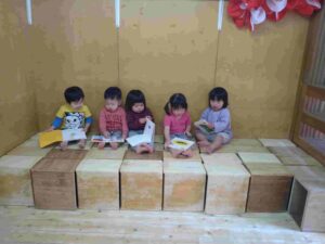 絵本を見る2歳児クラスの子どもたちです。