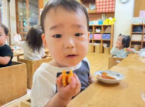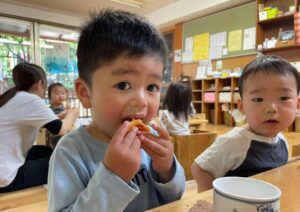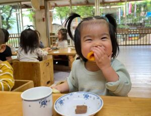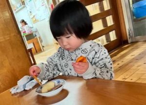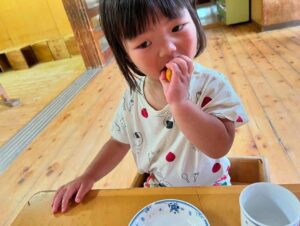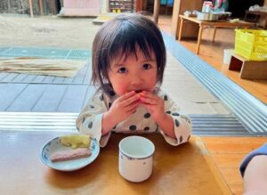 おやつの前に、縁側で「びわ」のうたを歌ったようです。
