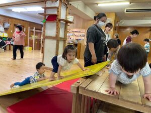 保育参観では、親子触れ合い、アスレチック、新聞遊び!と、たっぷり遊びながら交流!