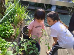 「これトマトになるねんで」「ピーマンやで」と日に日に大きくなる野菜の成長に驚く子どもたちです。