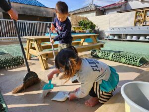 ベランダの『カフェ』の掃除にハマっている子どもたちです。