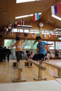グラウンドのように広くはないですが、ホールの中を一生懸命ゴールまで走ったり、障害物遊びを楽しみました。