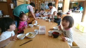 園庭でたくさん遊んだ3歳児つばめ組の給食の様子。