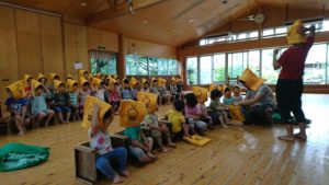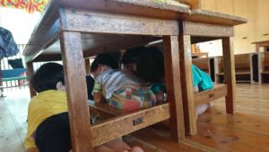 今朝の地震を受けて、登園後ホールにて2歳児~5歳児対象に『地震について』紙芝居を読んでもらったり、机の下などに隠れること、頭巾の被り方などを確かめ合いました。