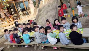 お昼寝後、4歳児の子どもたちが早くも園庭に降りてきました。