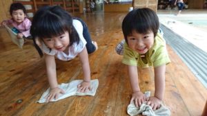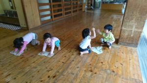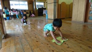 3歳児つばめ組の子どもたちが一生懸命雑巾がけをしてくれます。