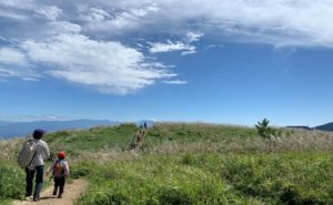 頂上では、きれいな青空と白い雲。あたり一面の笹とすすき。