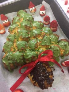 クリスマスツリーのケーキとイチゴのサンタのおやつ。