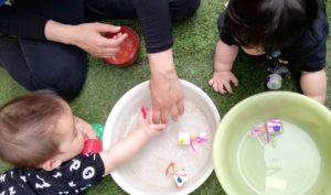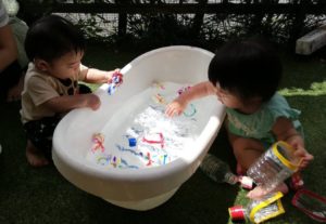 そんな中、水遊びを楽しく豊かにできるようにと、各クラスで様々の環境設定が行われています。