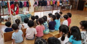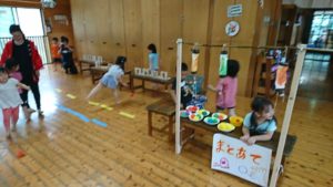 写真は「3歳児と5歳児のお店屋さんごっこ」の様子です。