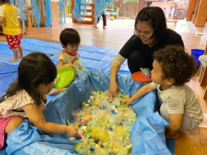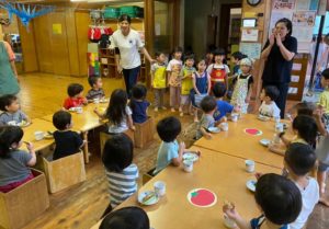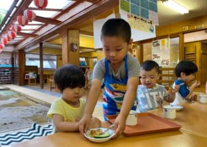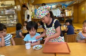今回の写真は、4歳児がレストランの店員になり2歳児の子どもたちへ「おやつ」を提供している様子です。