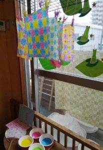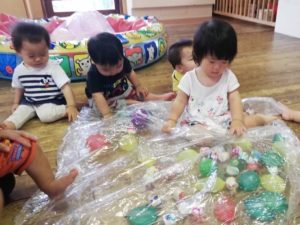 0歳児の部屋でも、先生たちのおもしろい仕掛けで楽しい「夏まつり」が始まっています!