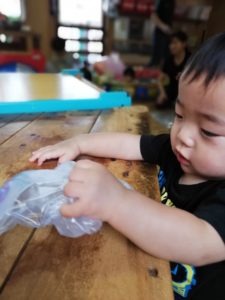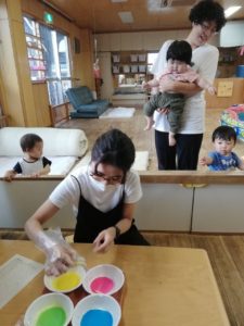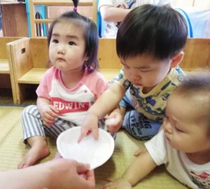 0歳児ひよこ組でも『夏まつり』へむけて何かできないか?ということで様座な取り組みを行っているようです。