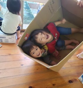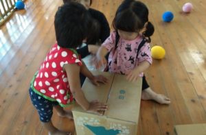 段ボールで太鼓のように遊んだり、シール張りを楽しんだりと、雨が続いてもお部屋で楽しく遊んでいます。
