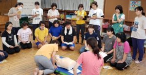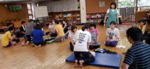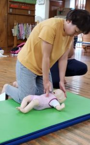 例年なら6月に消防署の方に来てもらい『救急救命講習』を開催して頂くのですが、今年はコロナの影響で講習会はできないとなりました。しかし救急救命の学習は、とても大切なので職員の看護師の先生にリードをしてもらって、人口呼吸や心肺蘇生、AEDなどの実技を教えて頂きました。