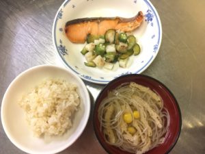 星形のオクラや、お汁には「天の川」をイメージしたビーフンの中に薄揚げとコーンを散らしました。