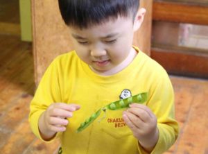 昨日5歳児が収穫してくれた『えんどうまめ』のまめむきを各クラスの子どもたちがやってくれました。