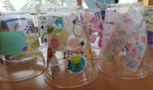 「みんなで楽しい夏を!」ということで、子どもたちの手形に続いて、保護者の方には透明のコップにマスキングテープで飾り付けをしてもらいました。
