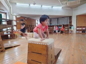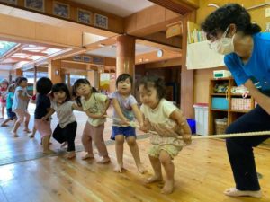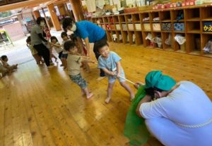 運動会で『タイヤ引き』をするのですが、その前段階で「引っ張り」遊びに取り組んでいます。