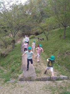 末次保育園では、この園バスを活用しての「枚岡公園」遠出を、時期によりますが3~5歳児は積極的に取り入れ、四季折々自然豊かな場所で遊べる活動を積極的に取り入れていきます。