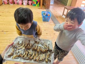 朝から大忙しの調理でしたが、子どもたちも楽しみにしてくれ、たくさん並べられたイワシの見学に来る子も^ ^