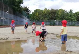 見つけた大きな水たまりに入って大はしゃぎ!