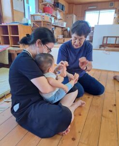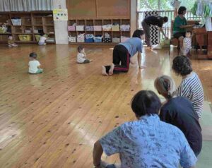 0歳児の遊びの様子を、温かく見守ってくれるおじいちゃんとおばあちゃん。